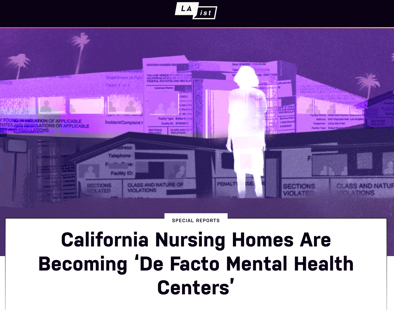 "All over California, people with serious mental illness are living in nursing homes that experts say weren’t meant to care for them — an investigation by LAist, APM Research Lab and The California Newsroom reveals. Some call it 'warehousing' and say the practice might violate federal laws. The consequences have been deadly."